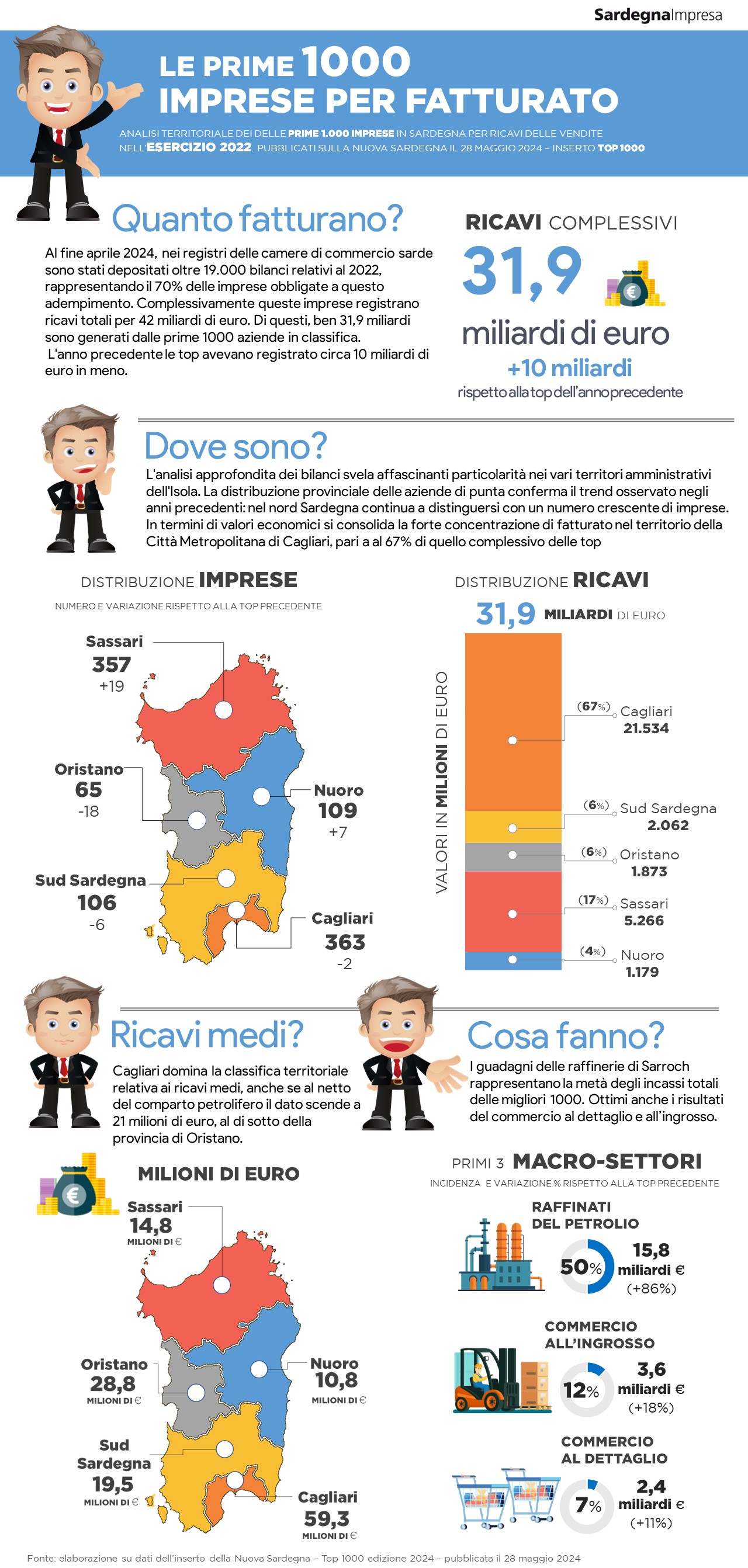 Dal punto di vista economico la città Metropolitana di Cagliari si conferma il cuore dell'Isola, consolidando una forte concentrazione di fatturato pari al 67% del totale delle top aziende, in crescita rispetto al 60% dell’edizione precedente. Questo dato è fortemente influenzato dalle attività delle raffinerie del comune di Sarroch, che hanno contribuito con oltre 15 miliardi di euro al fatturato totale.