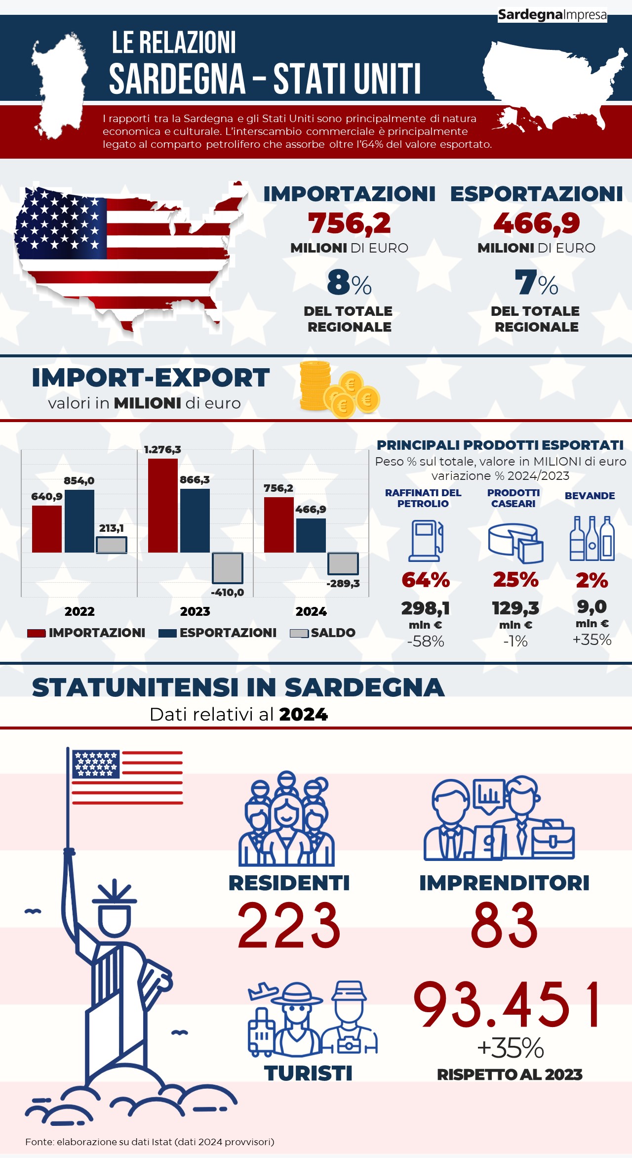 Nel 2024 l’interscambio commerciale tra la Sardegna e gli Stati Uniti ha raggiunto i 1,22 miliardi di euro, di cui 756 milioni in importazioni e 467 milioni in esportazioni. Il commercio tra le due aree resta fortemente legato al comparto petrolifero, che incide in modo determinante su entrambi i flussi.